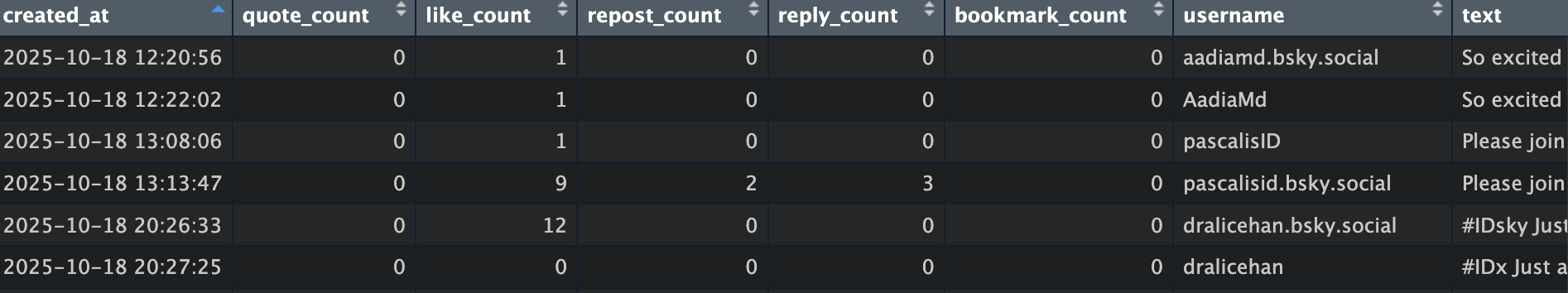 | 2025-10-19 | boghuma.bsky.social | Who is in Atlanta for #IDweek2025? If you see me at the convention center please say hi ✋. It's always better to see/meet people IRL. #IDSky | 36 |