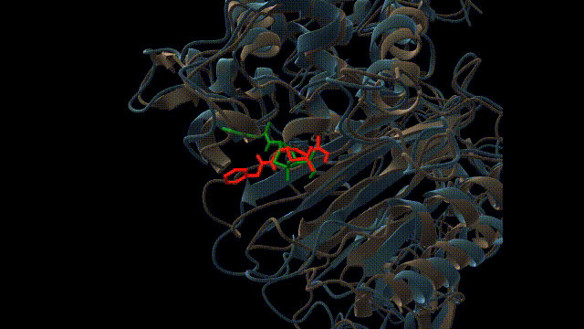 Download the pdb. If we use ChimeraX to visualize the pdb, it will look something like this. With the ligand (cefepime) highlighted in green.