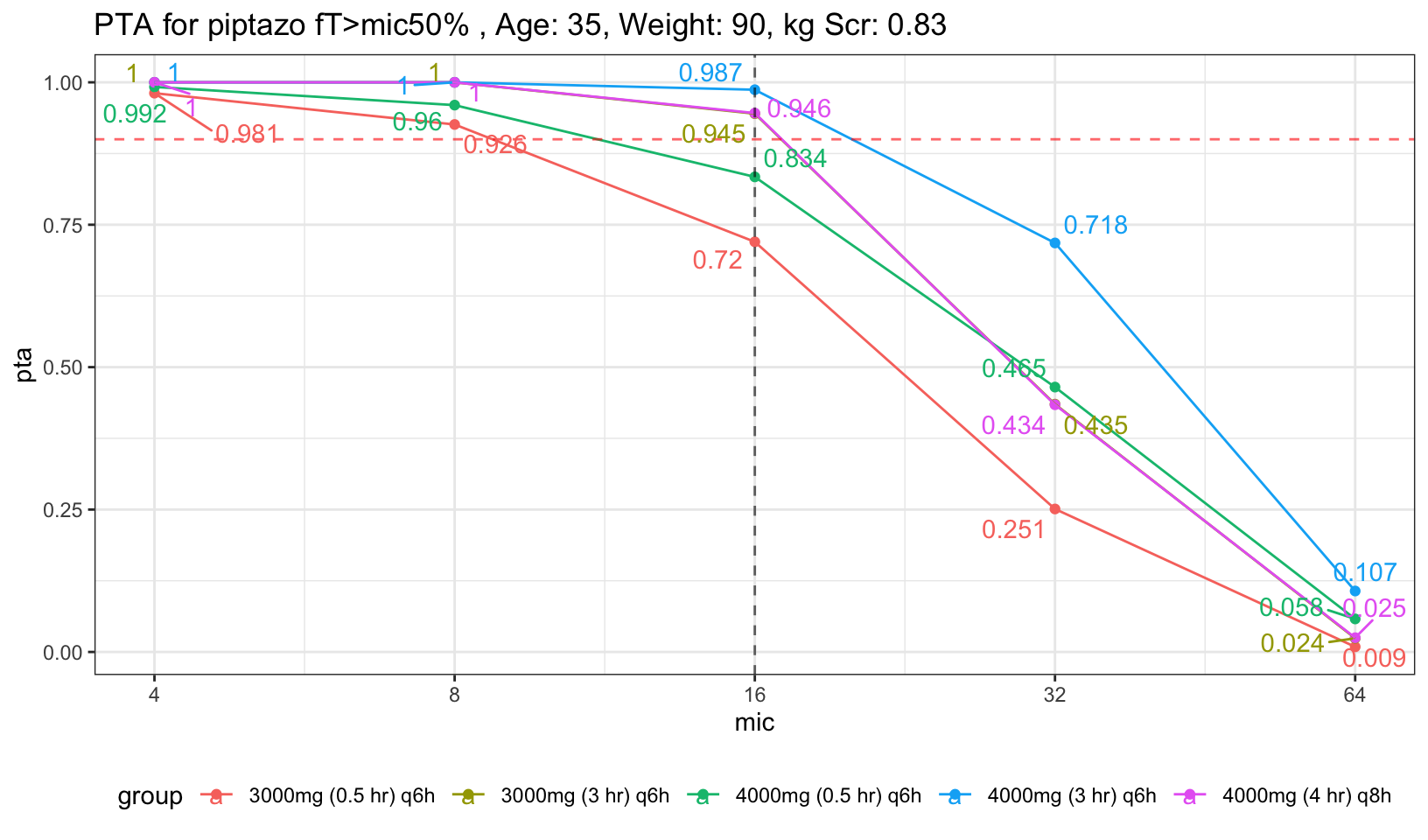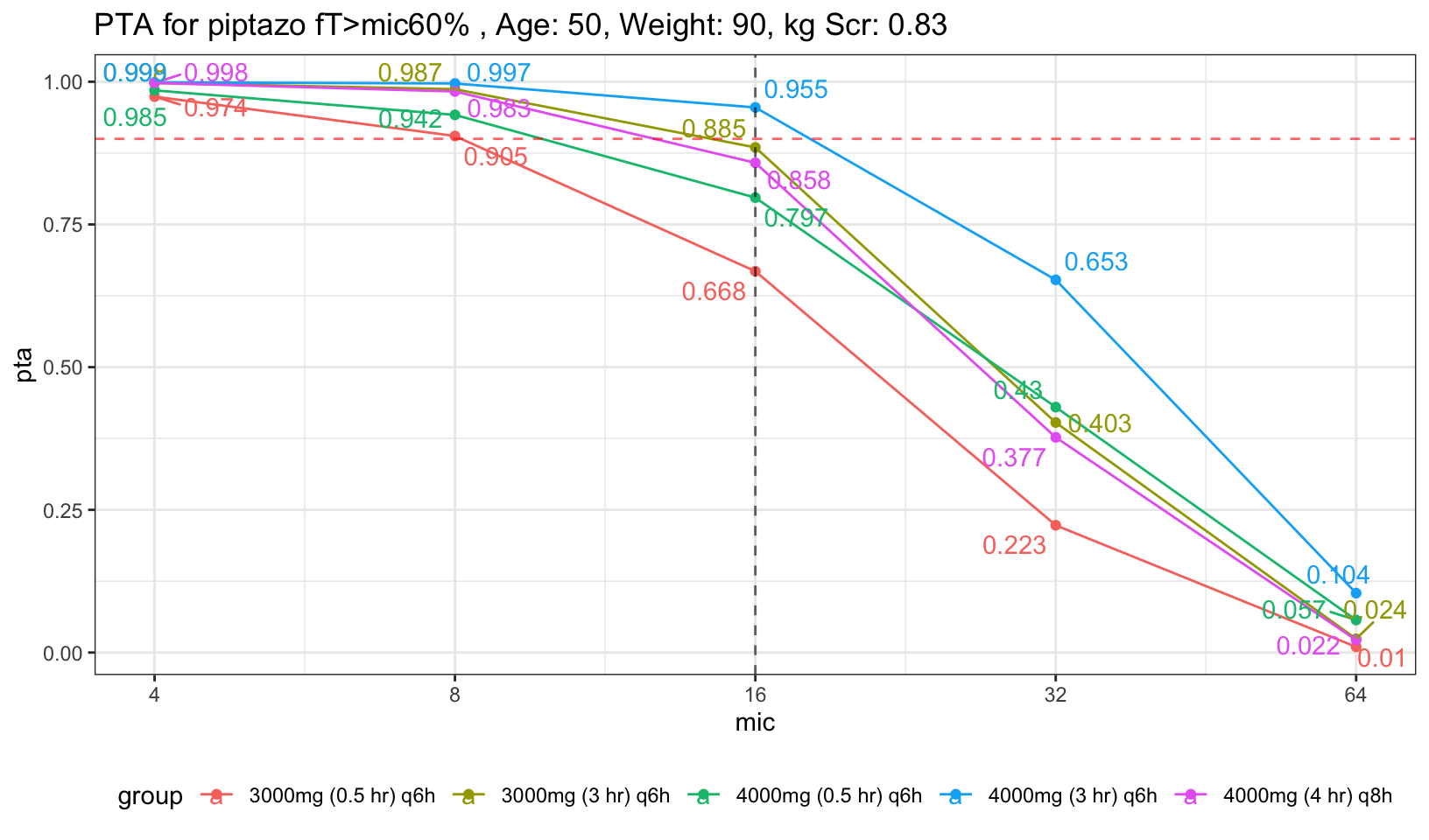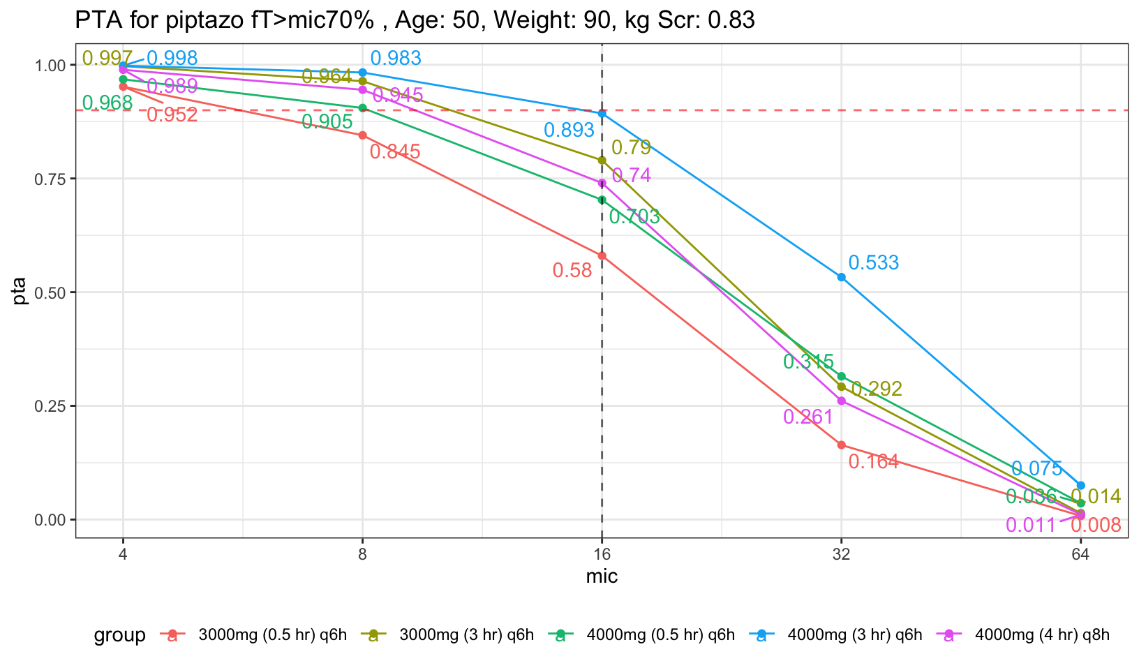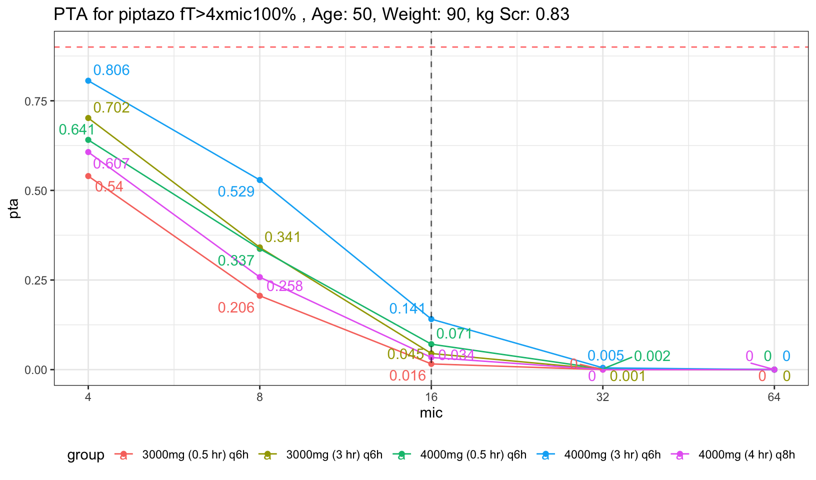For easier visualization, I placed a red dashed red horizontal line to indicate PTA of 90%, and also dashed black vertical line to indicate mic of 16, the highest mic to be classified as susceptible to piptazo. We can see that both the 30 min infusion regardless of 4g had less than 90% PTA. Now, what if we increase the age and Scr a little bit to represent average population who will need piptazo.
