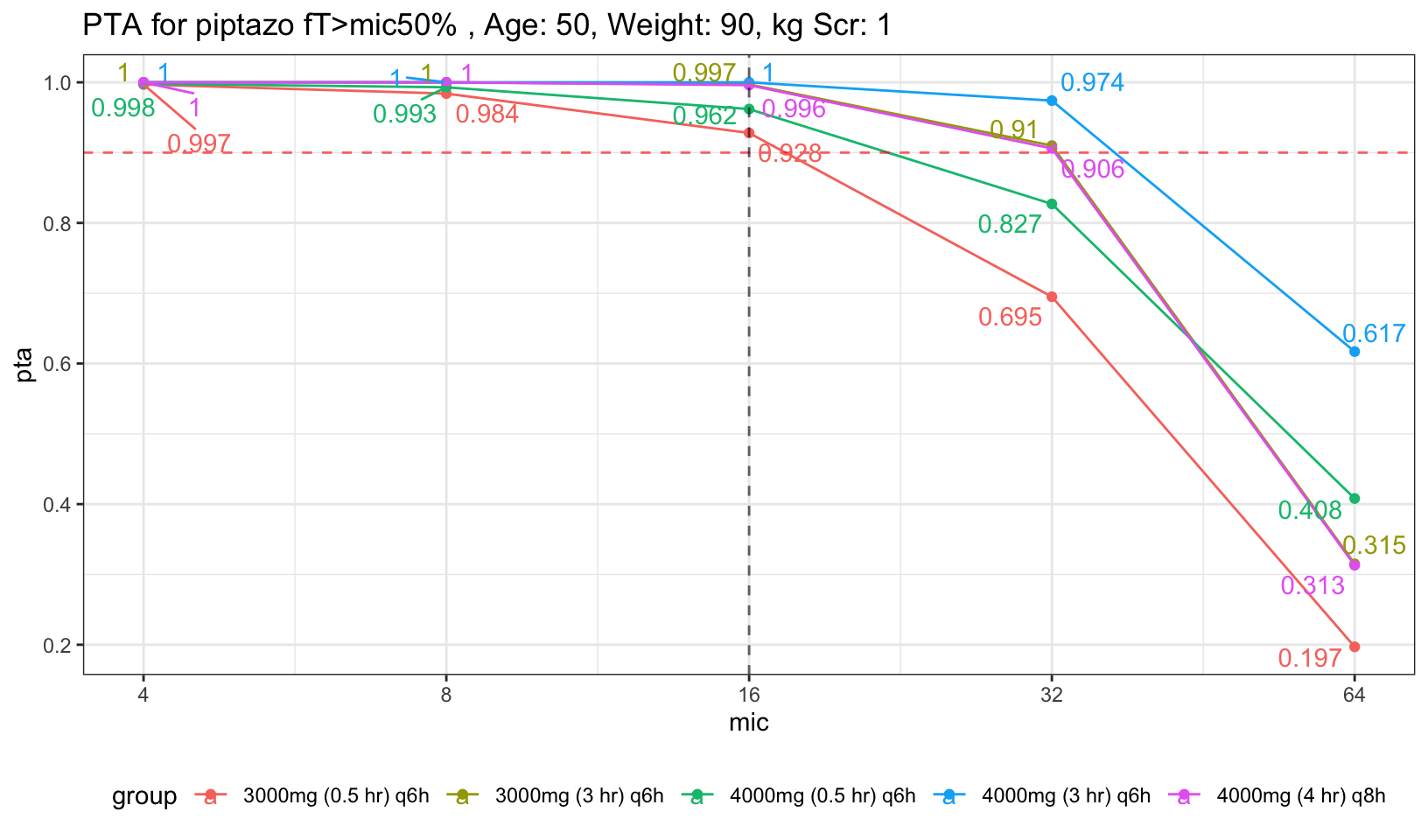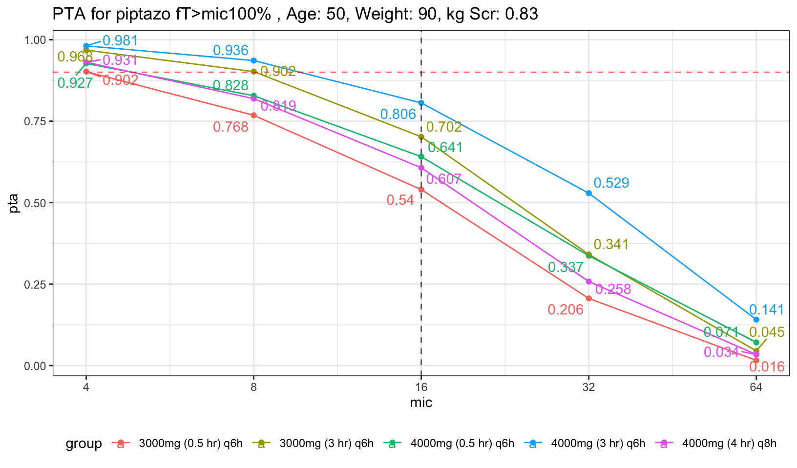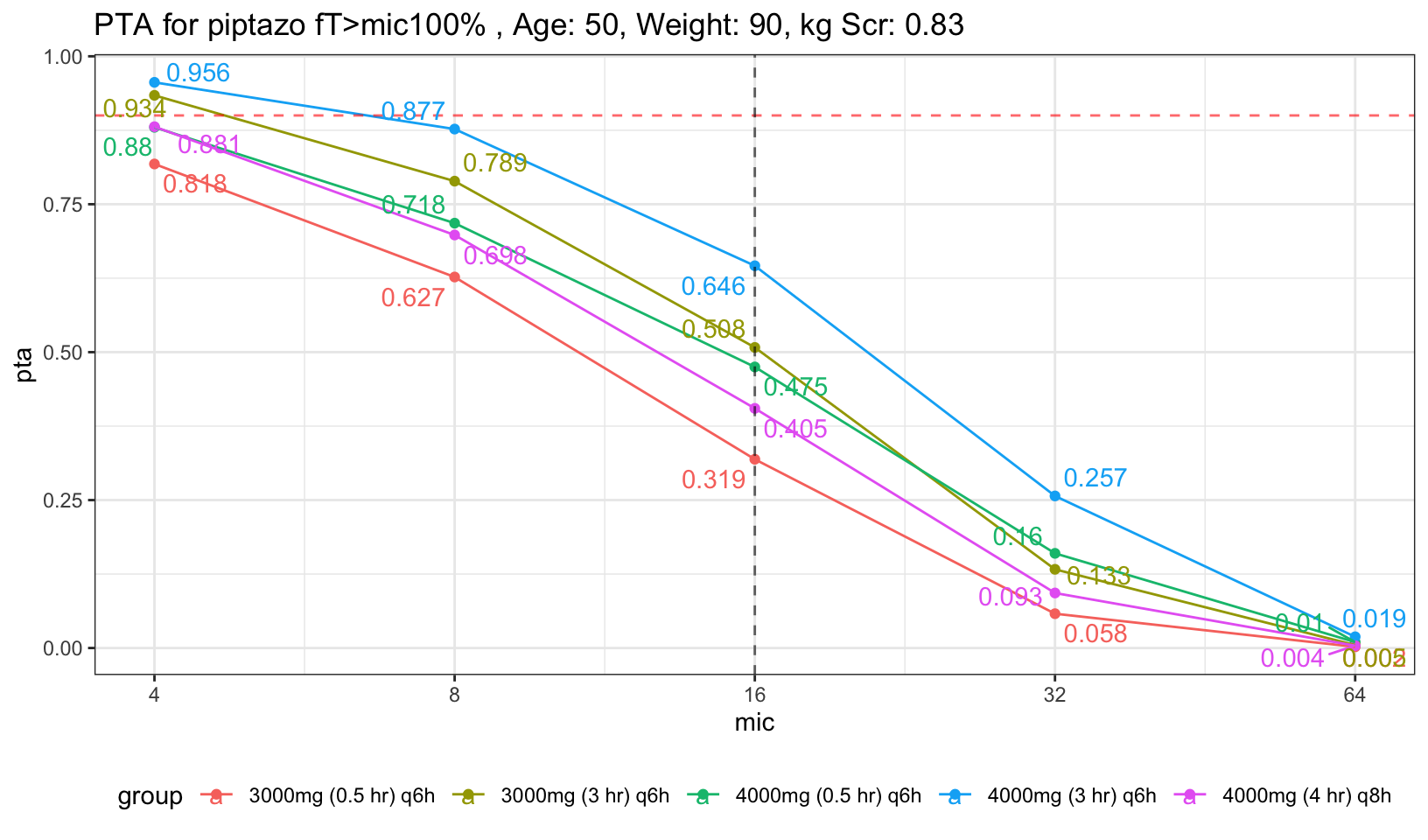 For easier visualization, I placed a red dashed red horizontal line to indicate PTA of 90%, and also dashed black vertical line to indicate mic of 16, the highest mic to be classified as susceptible to piptazo. We can see that both the 30 min infusion regardless of 4g had less than 90% PTA. Now, what if we increase the age and Scr a little bit to represent average population who will need piptazo.