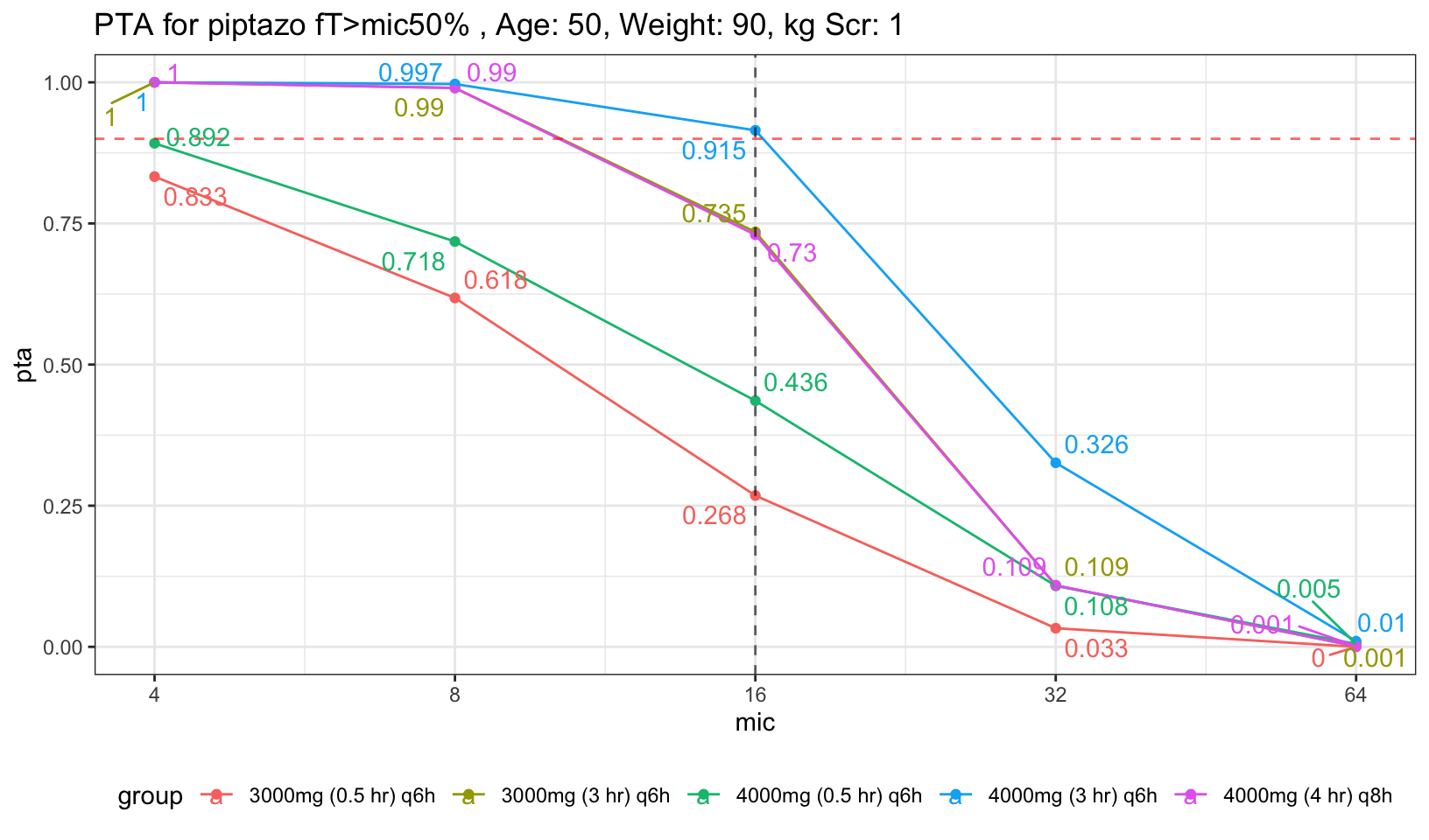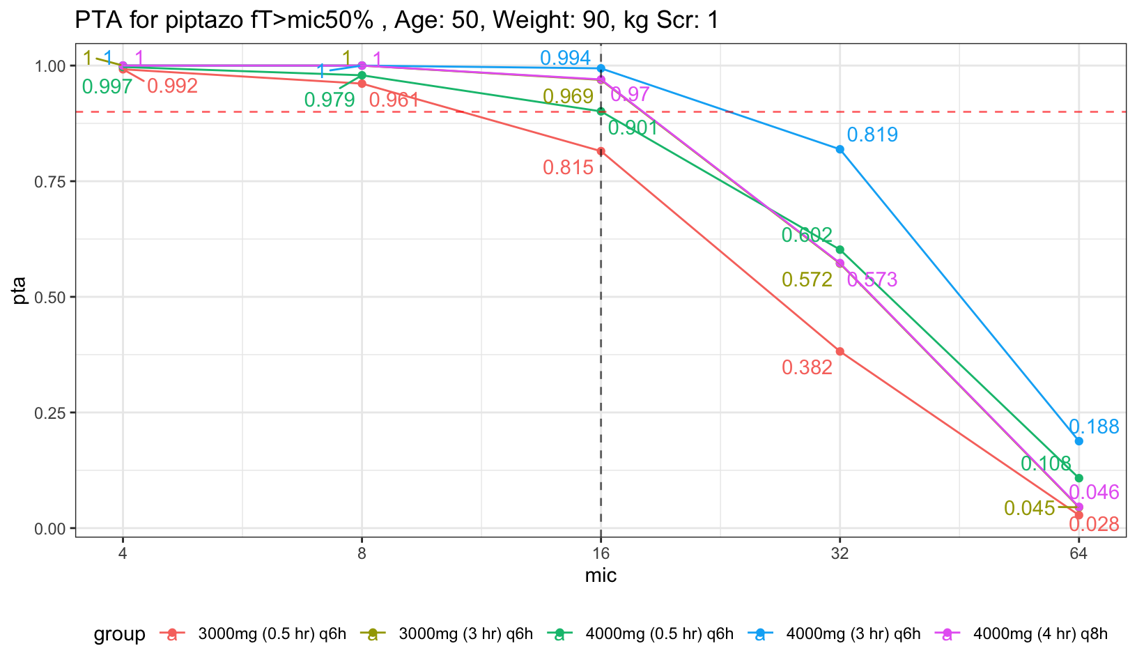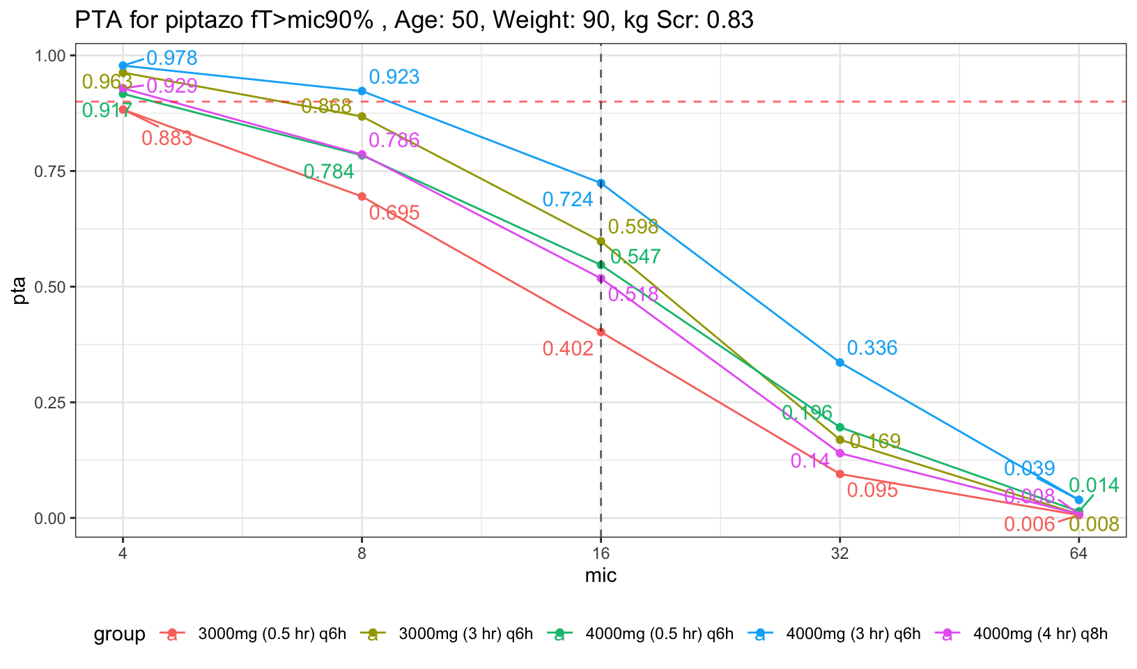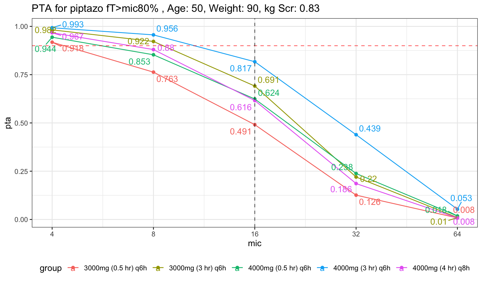 For easier visualization, I placed a red dashed red horizontal line to indicate PTA of 90%, and also dashed black vertical line to indicate mic of 16, the highest mic to be classified as susceptible to piptazo. We can see that both the 30 min infusion regardless of 4g had less than 90% PTA. Now, what if we increase the age and Scr a little bit to represent average population who will need piptazo.