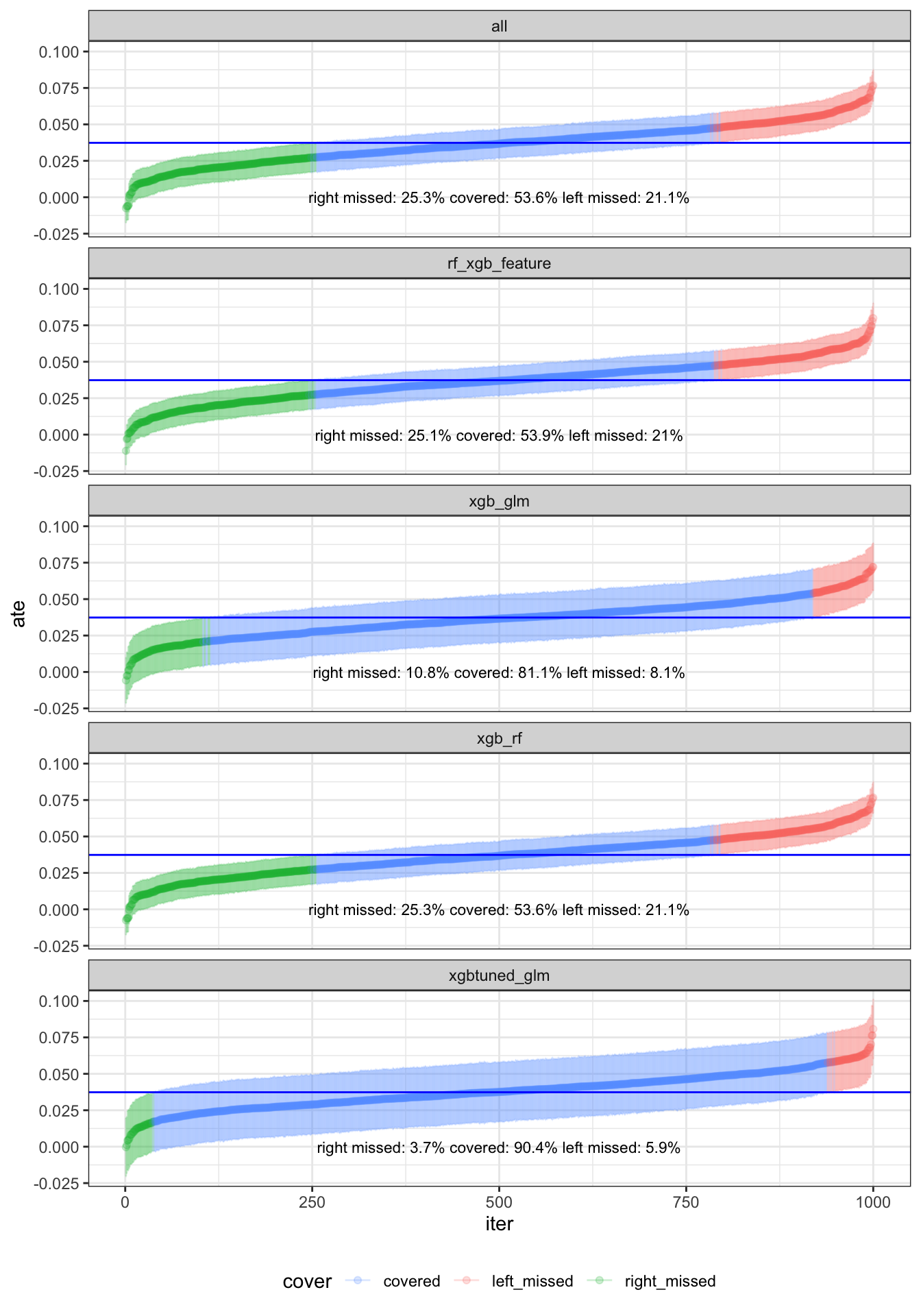 As previously, we’ve set up our true ATE and simulation and will sample 60% of the N=10000 and ran a bootstrap of 1000. This time, instead of solo ML, we will use Super Learner to ensemble several models and then estimate our ATE and if the 95% CI covers the true ATE. Below are the combinations we will investigate: